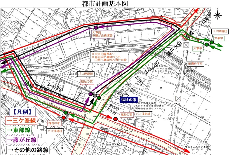 ・「福祉の家」バス停(三ケ峯線三ケ峯方向を除く)を現在の位置から西に移動します。