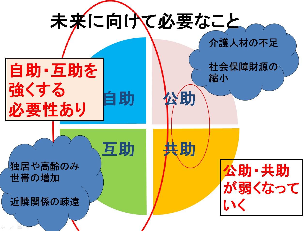 このため、公助や共助を補うものとして、自助・互助を強くしていく必要があります。