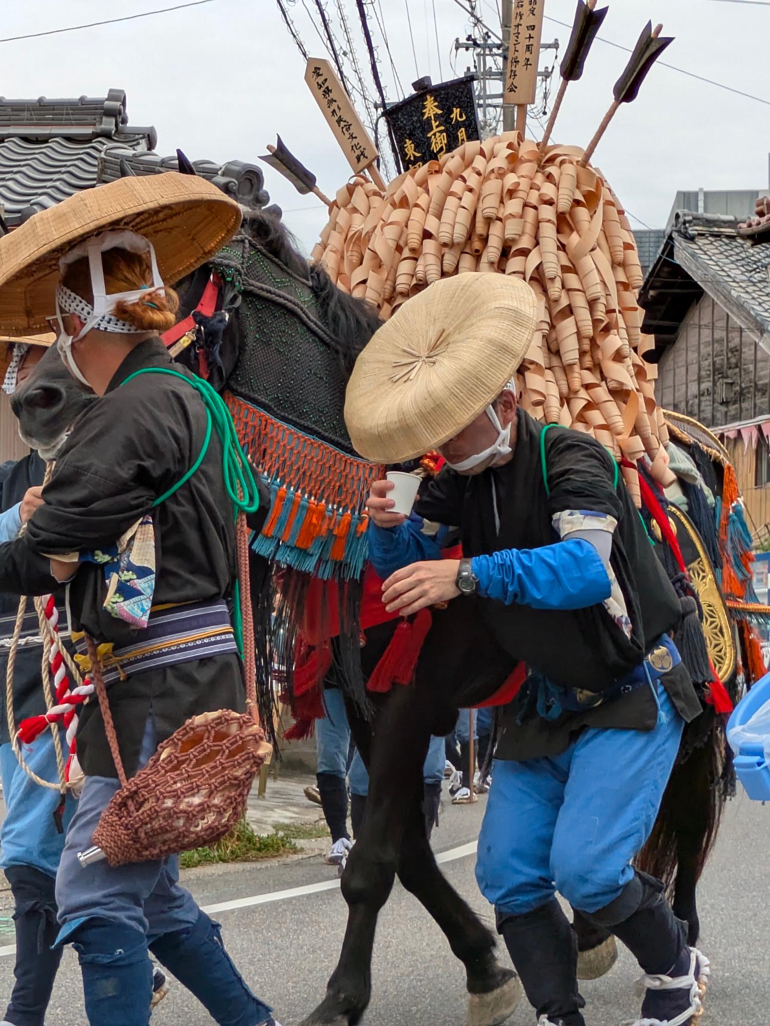 馬と活きる_警固祭りで背中にオマントを背負って練り歩く馬と、馬を曳いて歩く警固隊員の人馬一体の1枚