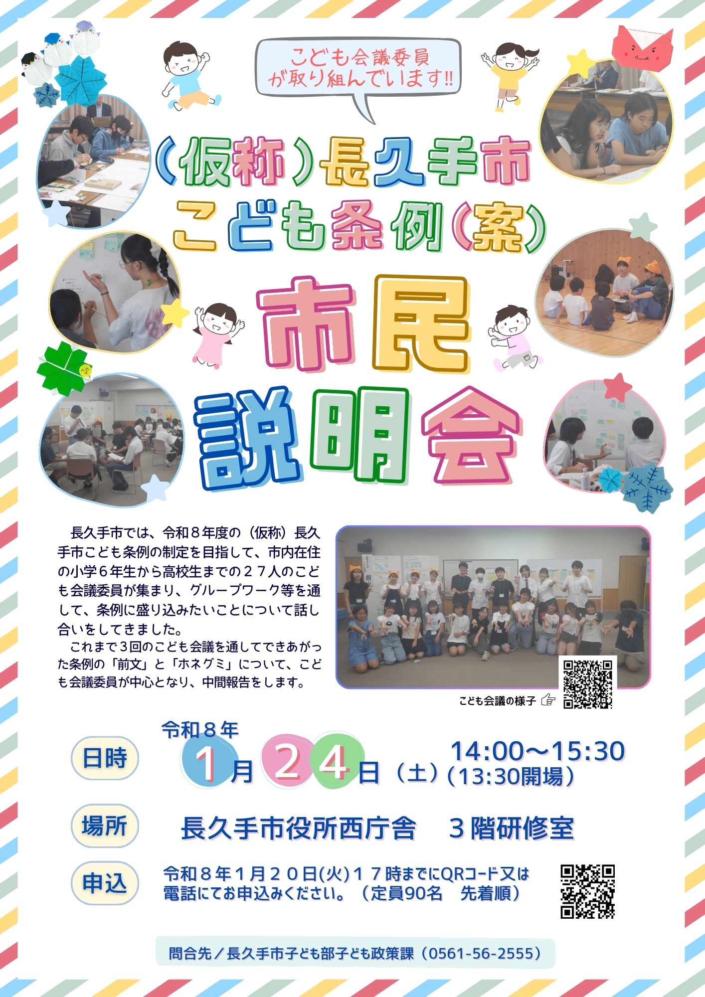 (仮称)長久手市こども条例(案)・市民説明会 更新日:2025年12月24日 申込み 参加を希望される方は、令和8年1月20日(火曜日)までに下記フォーム又は電話で申込みください。 申込みフォーム 電話番号:0561-56-2555 開催日時 令和8年1月24日(土曜日)14時から15時30分まで 開催場所 長久手市役所西庁舎 3階研修室 関連ページ ★こども会議委員の取組 ★(仮称)長久手市こども条例の制定に向けた取組 この記事に関するお問い合わせ先 子ども部 子ども政策課〒480-1196 愛知県長久手市岩作城の内60番地1電話番号:0561-56-2555ファックス:0561-63-2100メールフォームによるお問い合わせ